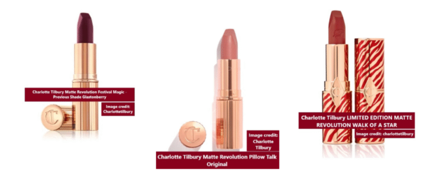 - Charlotte Tilbury’s moisturizing matte Matte Revolution formula, designed to provide a soft, velvety finish.