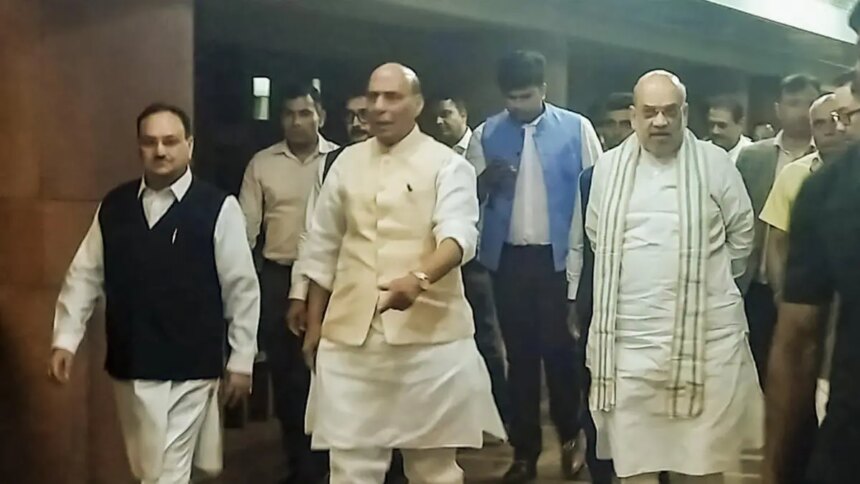 Defense Minister Rajnath Singh, with the Interior Minister of the Union, Amit Shah, and the Minister of the Union and the national president of BJP, JP Nadda, leaves after a meeting of all the Covened parties for the center in the terrorist attack of Pahalgam, in New Delhi, on Thursday, April 24, 2025.